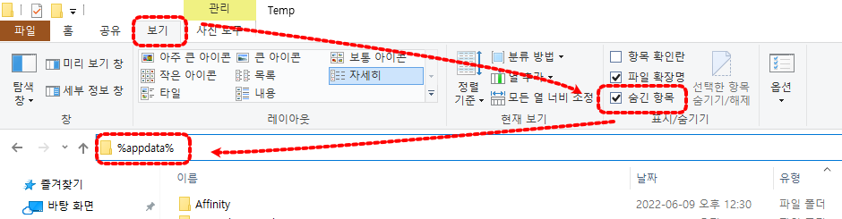 탐색기 경로 입력창에 "%appdata%"를 입력하고 enter를 누르세요.
