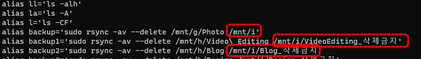 가끔 외장 하드의 드라이브명이 i 가 아닌 j로 바뀌는 경우가 있던데요. 이런 상황을 모른 상태에서 rsync 명령을 실행해버려서 /mnt/i/ 디렉터리를 생성해서 백업이 된 상태였습니다.