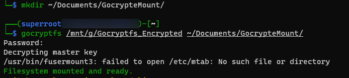 gocryptfs /mnt/g/Gocryptfs_Encrypted ~/Documents/GocrypteMount/ 와 같이 gocryptfs 명령어 뒤에 암호화 폴더명 경로, 마운트 시킬 디렉터리 순서로 명령어를 사용하시면 됩니다.