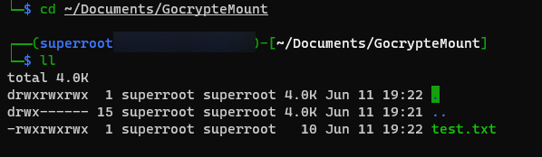 암호화 디렉터리(Gocryptfs_Encrypted)와 잘 마운트되면 Kali Linux에서는 GocrypteMount 디렉토리의 배경이 녹색으로 보이게 됩니다.