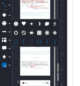 가장 많이 사용되는 도구들은 왼쪽에 구성되어 있습니다. 도형, 선, 화살표, 색상, 이모티콘 등..