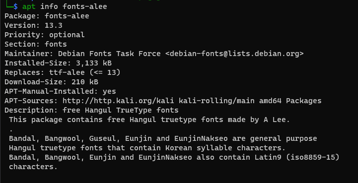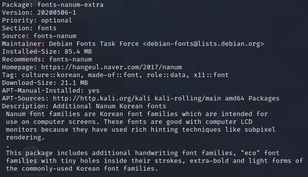 이런 정보를 확인하시려면 apt info fonts-nanum-extra와 같이 apt info 패키지 명을 사용하여 확인할 수 있습니다.