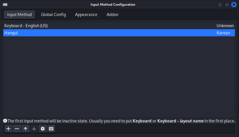 fcitx-config-gtk3 명령어 실행하여 'Input Method Configuration' 이 실행되면 "+" 버튼을 눌러서 "Hangul"을 추가해 주세요.