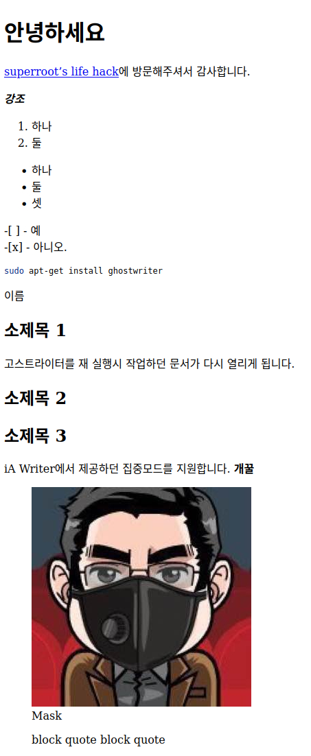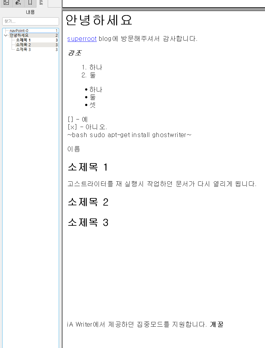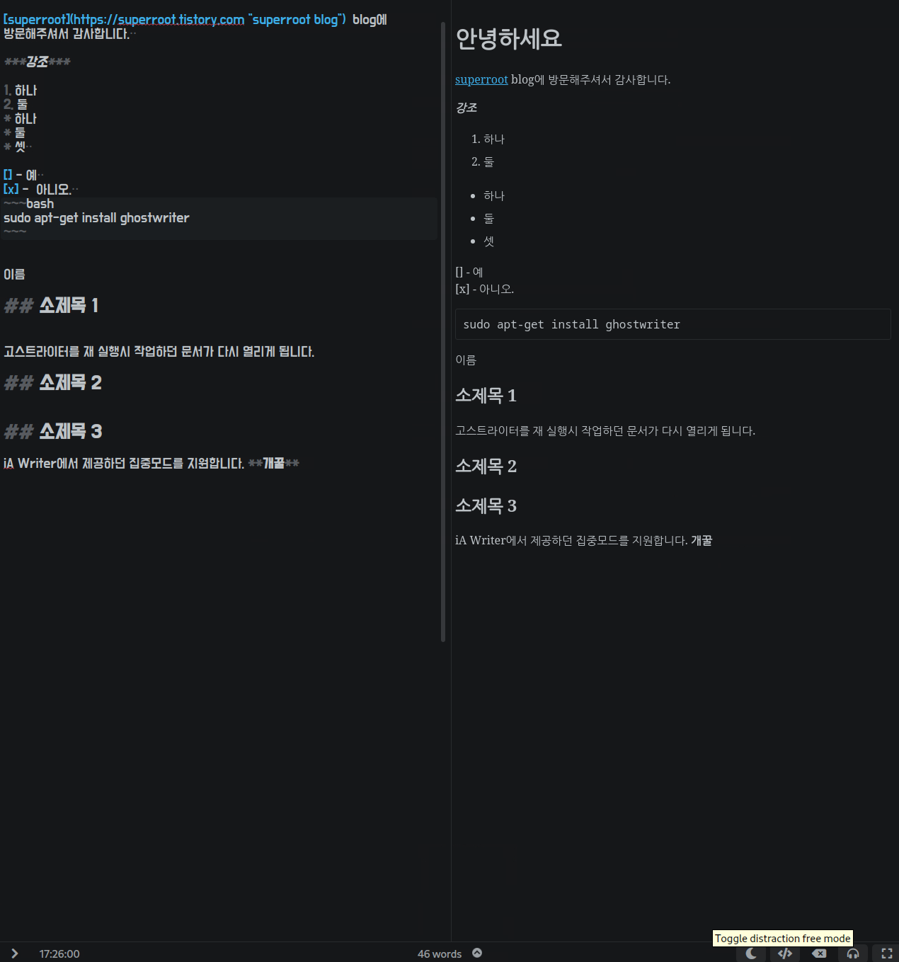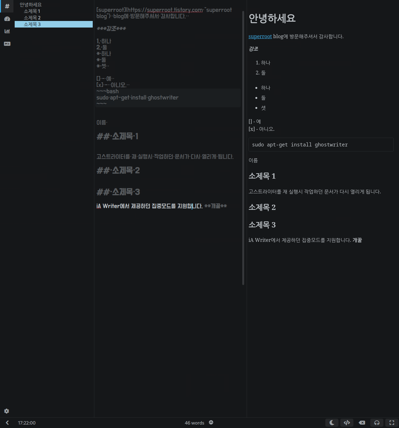 글을 작성하다 프로그램을 종료하고 다시 ghostwriter를 시작하면 최근에 작성하던 문서가 바로 열리게 됩니다. 작성하던 문서에서 바로 글쓰기가 가능합니다. 이 기능, 너무너무 마음에 들어요~