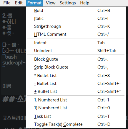 Markdown 문법이 생각나지 않을 때 이 메뉴에서 확인하고 사용하거나, Format 메뉴의 단축키를 바로 사용해서 사용할 수 있습니다.