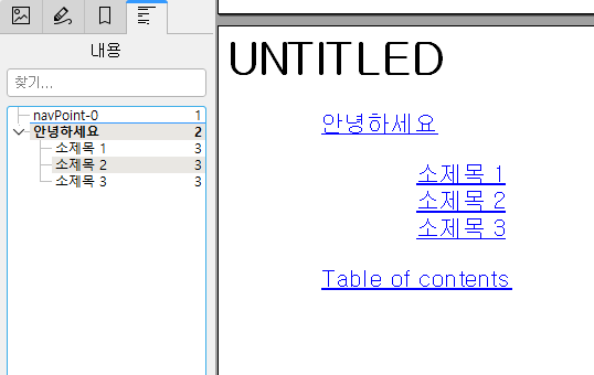 epub 문서의 경우 책갈피, Table of contents 가 자동으로 생성되며, Table of contents에는 본문과 링크까지 적용되는군요.