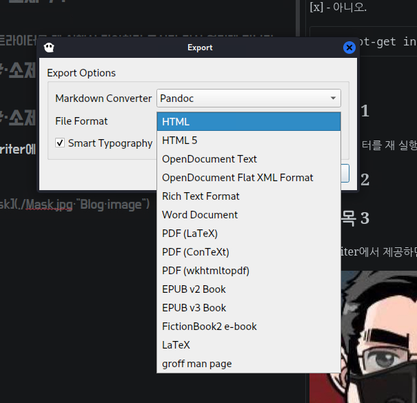 HTML5, OpenDocument Text, PDF, EPUB, LaTex 문서 등으로 변환이 가능합니다.