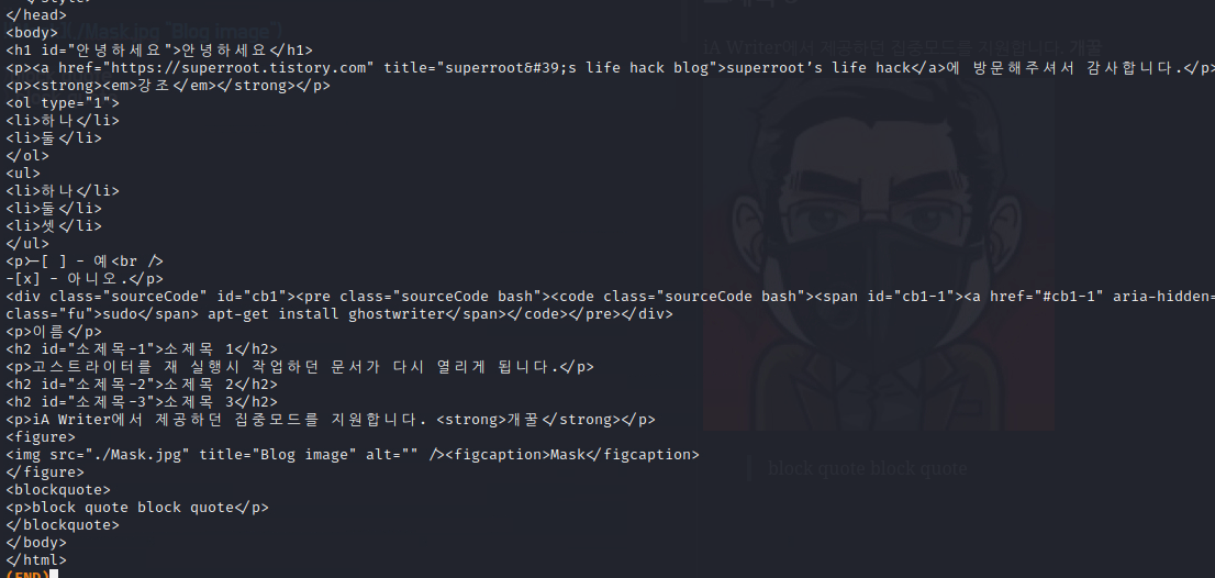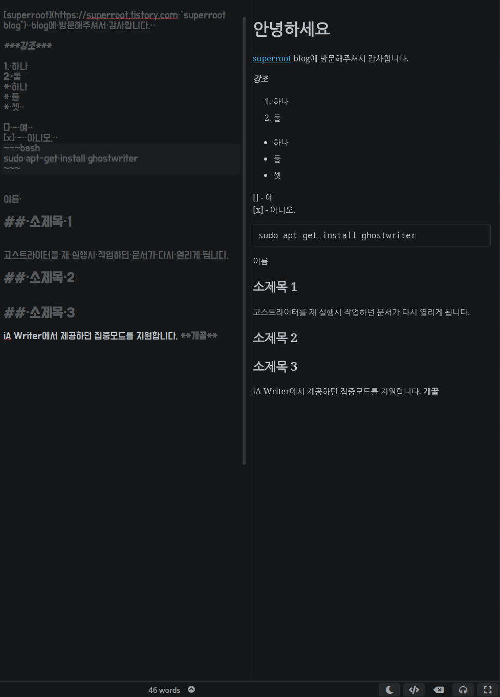 변환 없이 티스토리 Markdown 모드에 ghostwriter에서 작성한 글을 그대로 복사 & 붙여넣기 해도 됩니다.