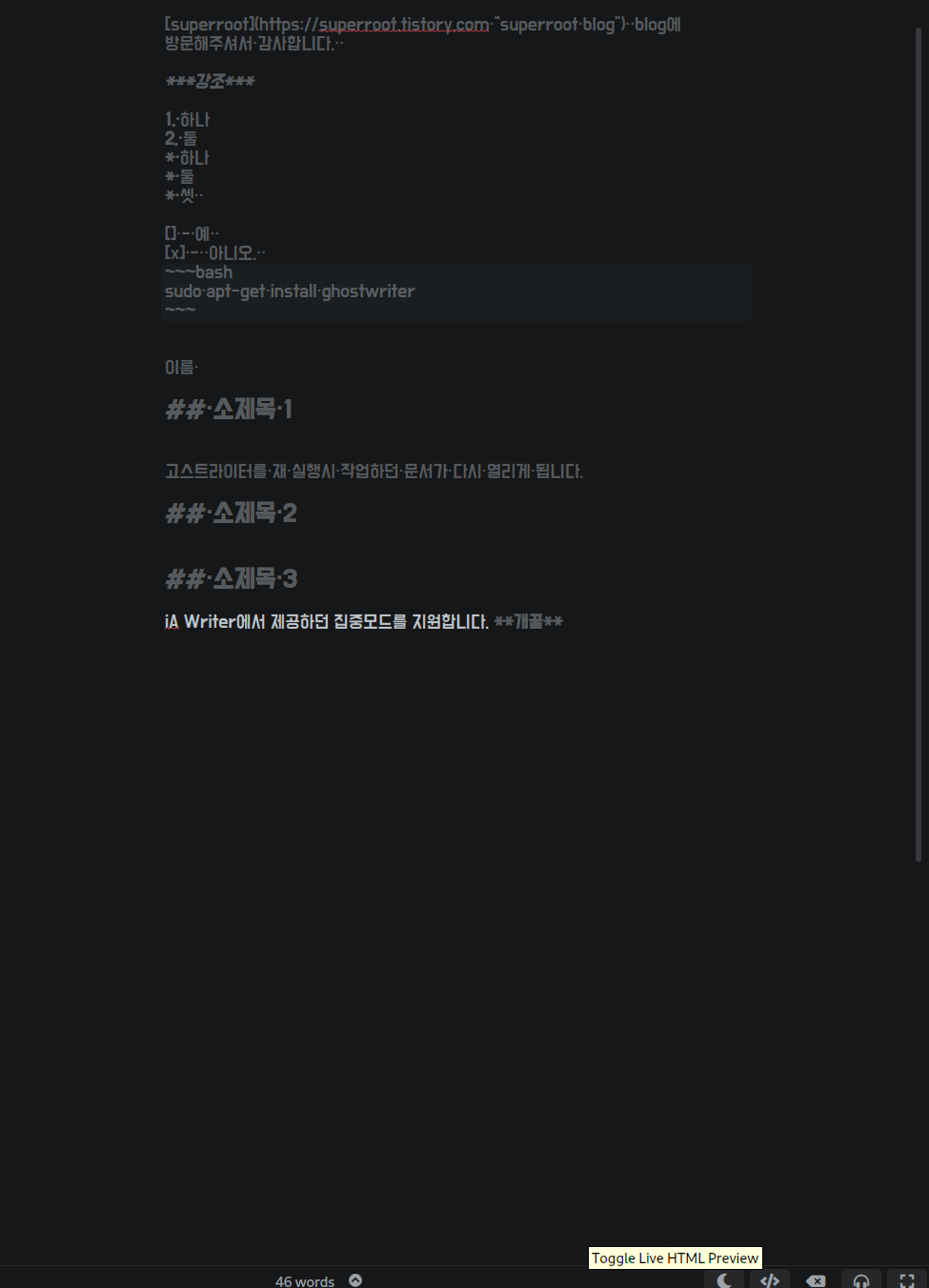 ghostwriter 프로그램은 좌측 - sidebar 부분, 중간 - 글 작성 공간, 우측 - HTML Preview 공간으로 구성되어 있습니다.