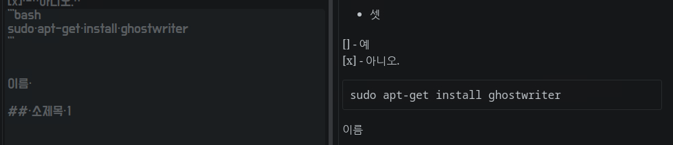 블로그 내용중에 코드블럭이 들어가는 것 역시 간단하게 ghostwriter에서 입력할 수 있습니다.