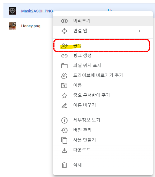 업로드가 완료되면 이미지를 선택하고 "마우스 오른쪽 클릭" 하여 "공유" 메뉴를 클릭합니다.