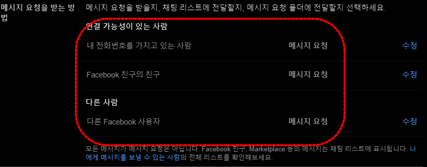 채팅이나 메시지를 보낼 수 있는 사람을 "친구"나 "친구의 친구" 또는 "메시지 요청"으로 제한을 두는 것이 좋습니다.