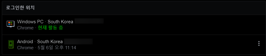 추가로 [로그인한 위치] 메뉴에서 내 기기가 맞는지 또한 로그인된 IP가 자신의 IP가 맞는지 확인할 수 있습니다.