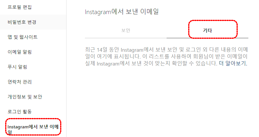 Instagram에도 "Instagram에서 보낸 이메일", "로그인 활동' 메뉴가 있습니다.