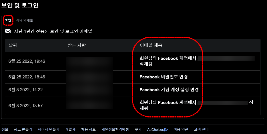 [설정] - [보안 및 로그인] - [Facebook에서 보낸 최근 이메일 보기] 메뉴 입니다.