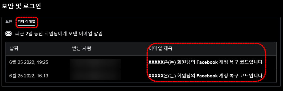 "보안", "기타 이메일" 각각 확인할 수 있습니다.
