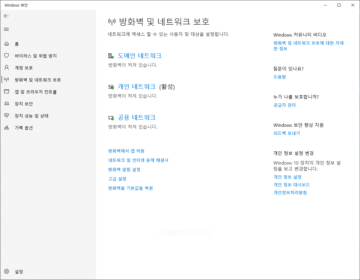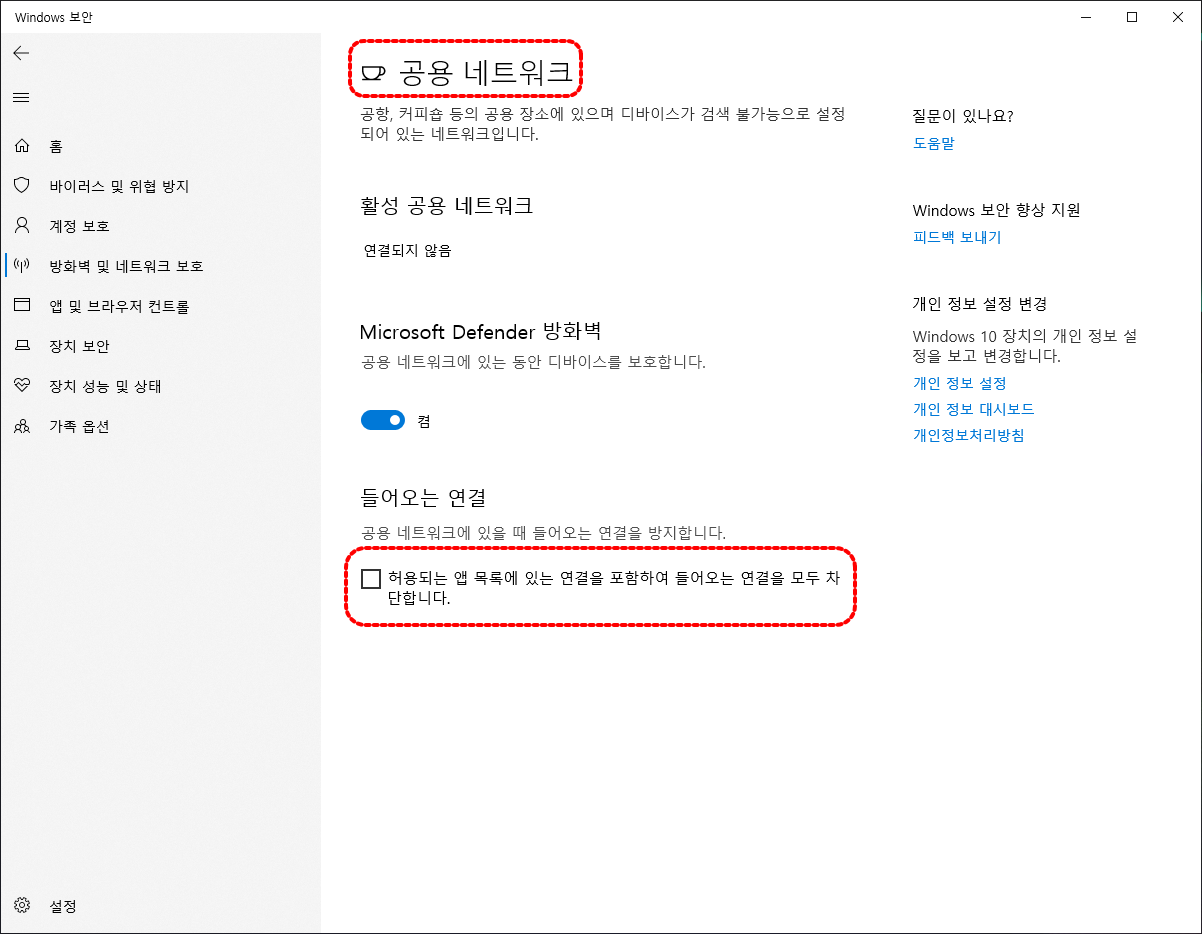 공용 네트워크 프로필 설정 확인