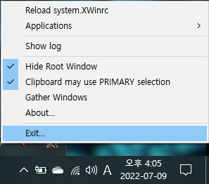 kex --sl -s 명령어를 사용하게 되면, vcxsrv.exe 가 windows에 실행되게 됩니다. 작업 표시줄을 잘 살펴보시면 해당 프로그램이 실행되고 있음을 확인할 수 있습니다. (갑자기 안 보이던 프로그램이 생겼다고 놀라지 마세요)