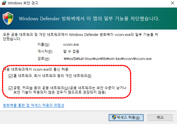 vcxsrv.exe 및 PulseAudio.exe 방화벽 허용 (공용 네트워크 프로필 통신 허용 필수)