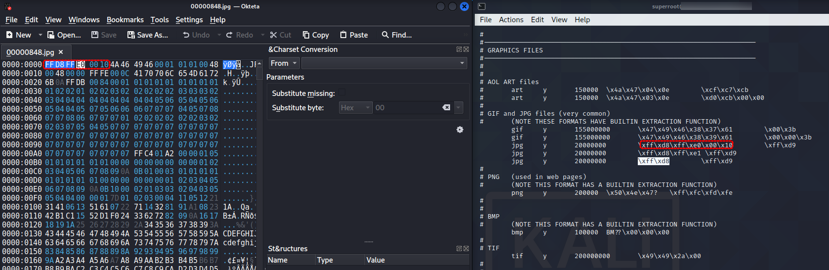 hexeditor로 jpg 파일을 한 번 열어보세요. FF D8 FF E0 00 10으로 시작하며, jpg 파일의 마지막은 FF D9로 끝나게 됩니다.