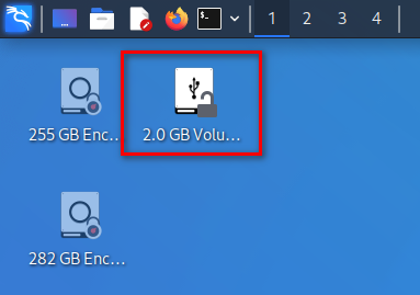 LUKS 암호화 설정 및 filesystem format이 완료된 저장 장치는 이제 Kali Linux에 꽂으면 위 사진처럼 바로 인식되며 더블 클릭하게 되면 암호를 물어보는 창이 뜨게 됩니다. 암호를 입력하면 자동으로 Kali Linux에 마운트가 완료됩니다.