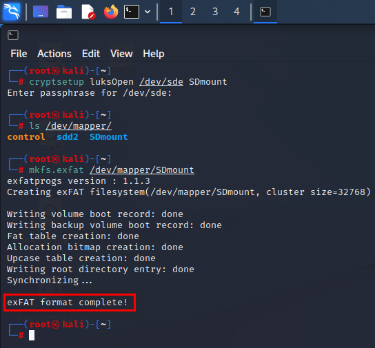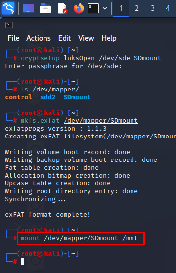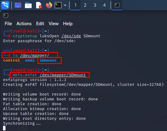 제 경우는 mkfs.exfat /dev/mapper/SDmount 명령어를 실행했습니다. 자신이 설정한 <name>을 잘 확인하시고 입력해 주세요.