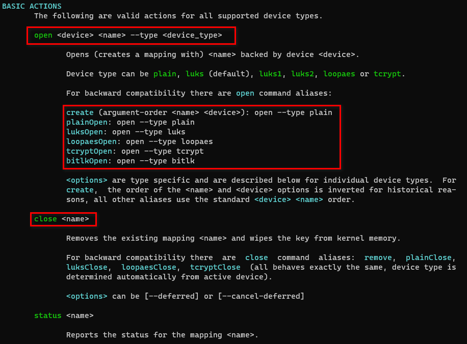 자세한 사용법을 확인하시려면 man cryptsetup 명령어를 입력해서 명령어 사용법을 살펴보세요.