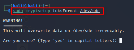 cryptsetup luksFormat <장치명> 명령어는 디스크에 LUKS 파티션을 초기화하고 암호를 설정하는 단계입니다. Kali Linux에서 sudo fdisk -l 명령어로 연결된 장치명을 잘 확인하시고 암호화를 적용하려는 <장치명>을 잘 확인하시고 적용하셔야 합니다.