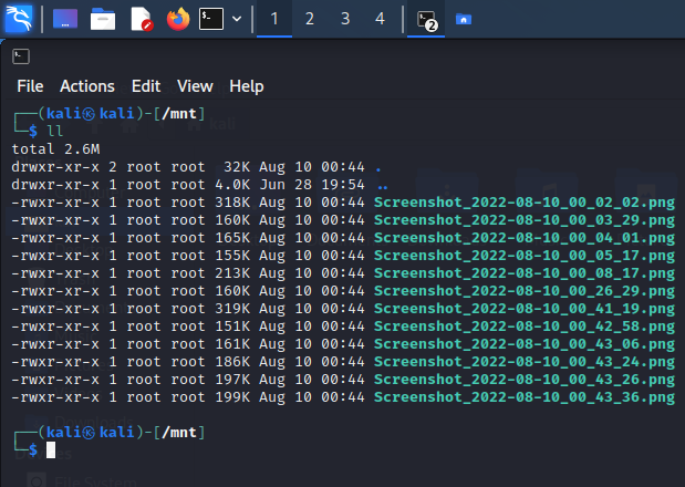 Kali Linux를 USB에서 live booting으로 부팅을 하는 경우 /mnt/ 디렉토리에는 아무런 파일이나 디렉터리가 없습니다. 따라서 저는 그냥 mount /dev/mapper/SDmount /mnt 명령어를 사용하여 /mnt 디렉터리에 바로 마운트를 시켰습니다.