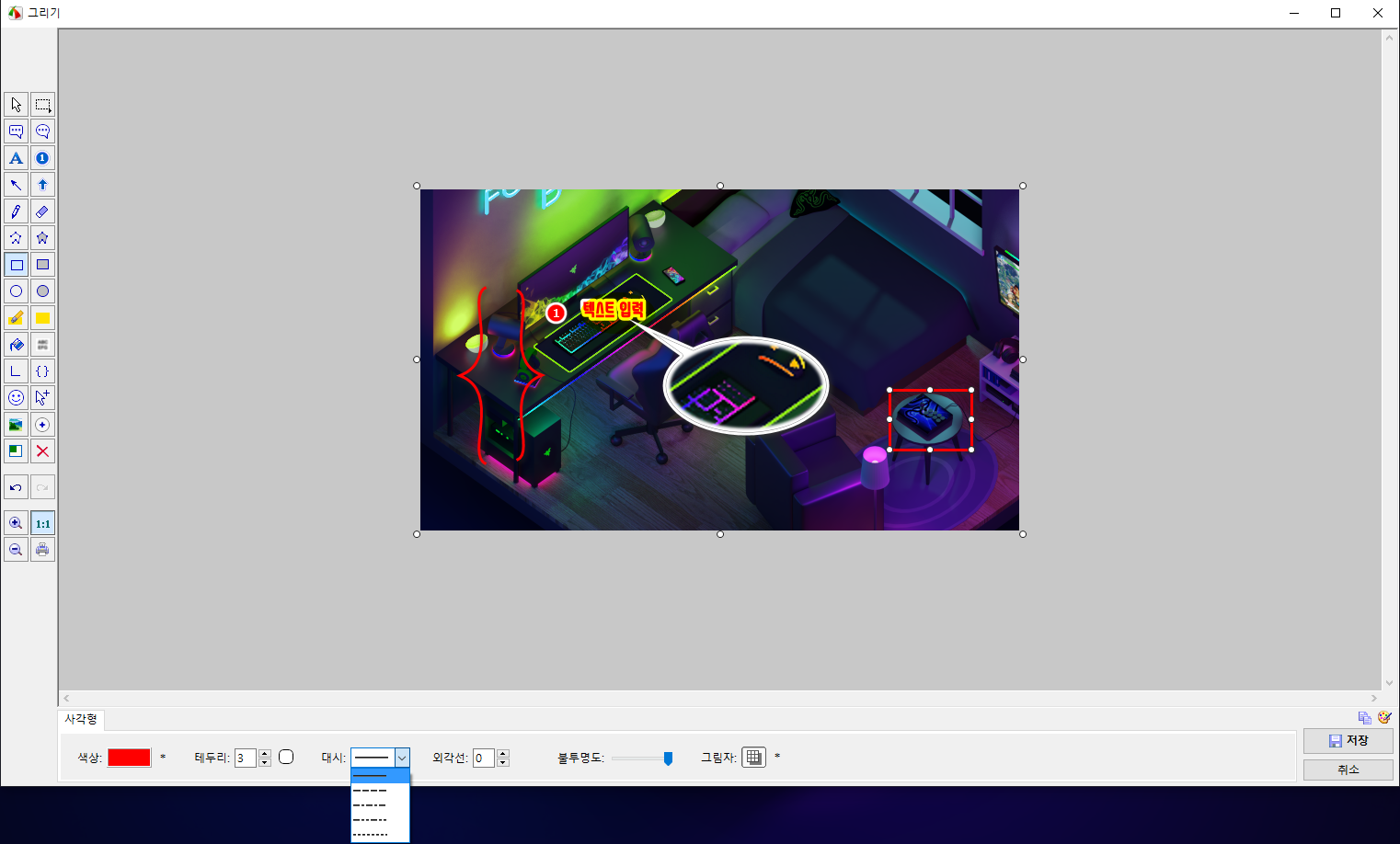 특정 부분을 하이라이트 시키기 위해서 많이 사용하는 사각형, 원, 하이라이트 도구를 사용할 수 있습니다. 도형의 경우, 색상, 테두리, 대시 모양(선, 점선...), 그림자등을 선택하여 적용할 수 있습니다.
