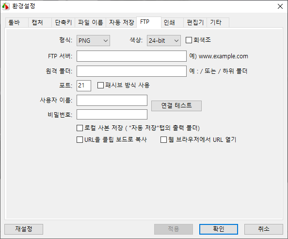 캡처 이미지를 FTP 서버에 저장시킬 수 있는 기능도 제공합니다. NAT나 FTP 서버에 캡처한 이미지를 업로드하고 싶은 경우, 이 기능을 이용하여 캡처 이미지를 업로드할 수 있습니다.