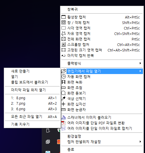 캡처 프로그램이지만 "편집기에서 파일 열기"를 통해서 이미지를 편집하거나 "여러 이미지를 단일 PDF 파일로 변환" 메뉴로 손쉽게 PDF 문서를 생성할 수 있습니다.