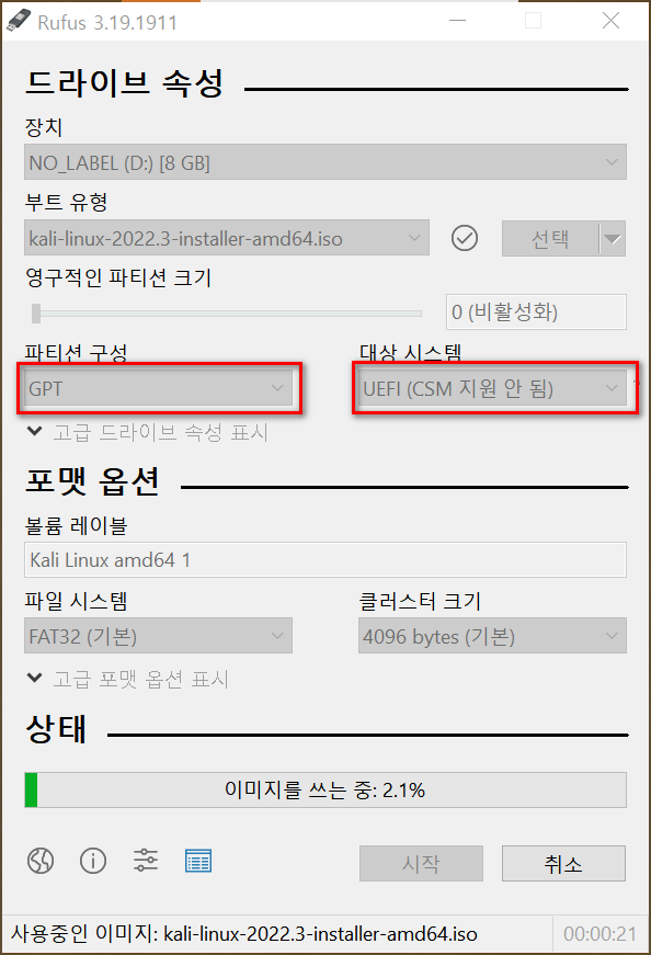 Kali linux 설치 이미지를 Rufus로 만들 때 주의사항이 있습니다. 파티션 구성 - GPT, 대상 시스템 - UEFI로 선택하고 시작을 눌러주세요, Kali Linux 이미지의 경우 하이브리드 이미지라서 자동으로 ISO 방식으로 선택되게 됩니다.