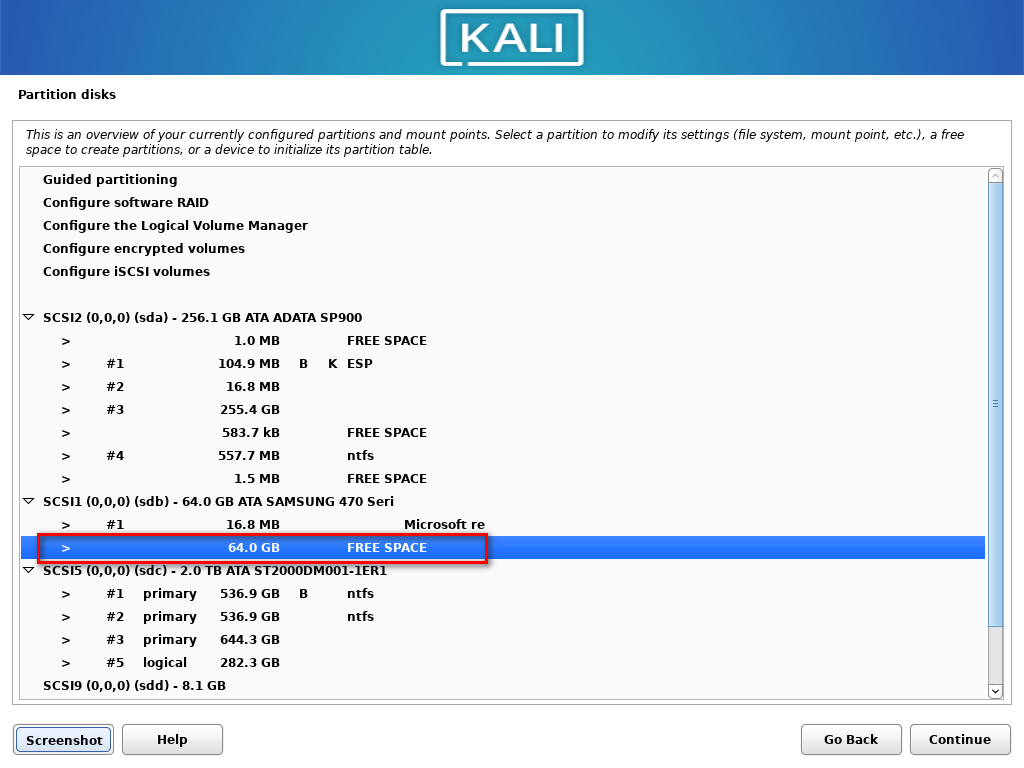 Kali Linux가 설치되는 SSD는 64GB 입니다. 용량이 적다보니, 파티셔닝을 좀 타이트하게 진행하도록 하겠습니다.