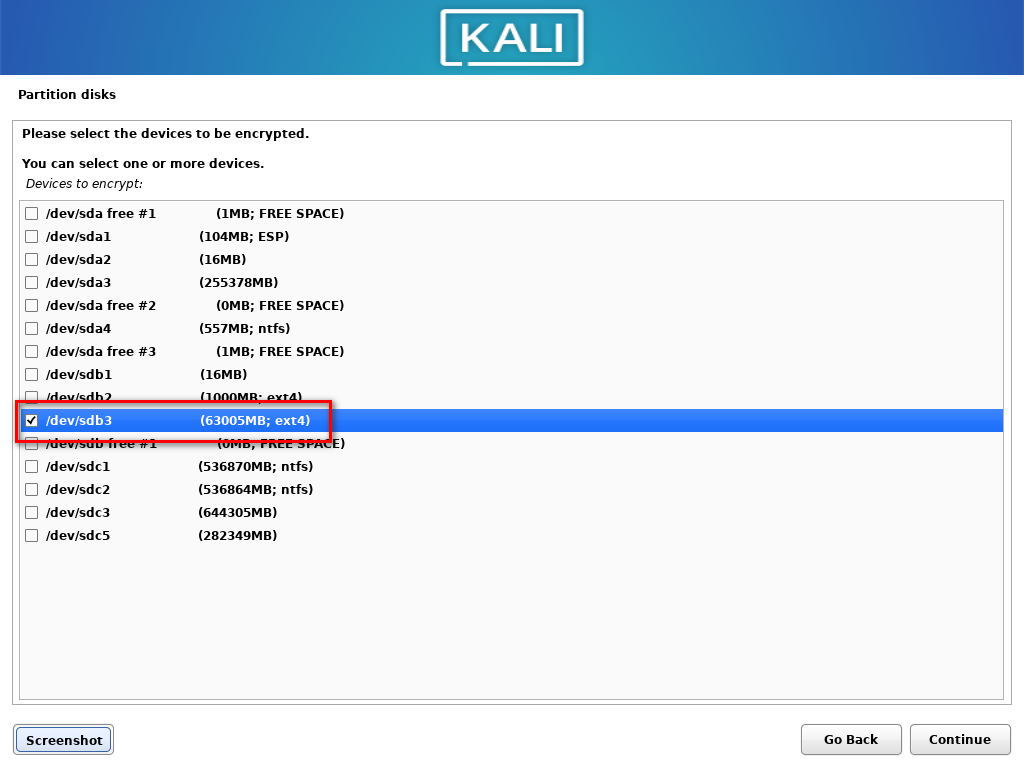 암호화를 진행할 device를 선택하라고 나오면 ext4, 용량 63005MB를 잘 확인하고 선택해 주세요.