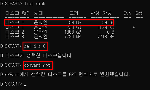 순서대로 입력하시면 disk 0을 삭제하고, GPT 형식으로 변환시켜주게 됩니다. disk 0를 clean으로 초기화하지 않으면 diskpart 명령어를 사용하여 GPT로 변환할 수 없습니다.