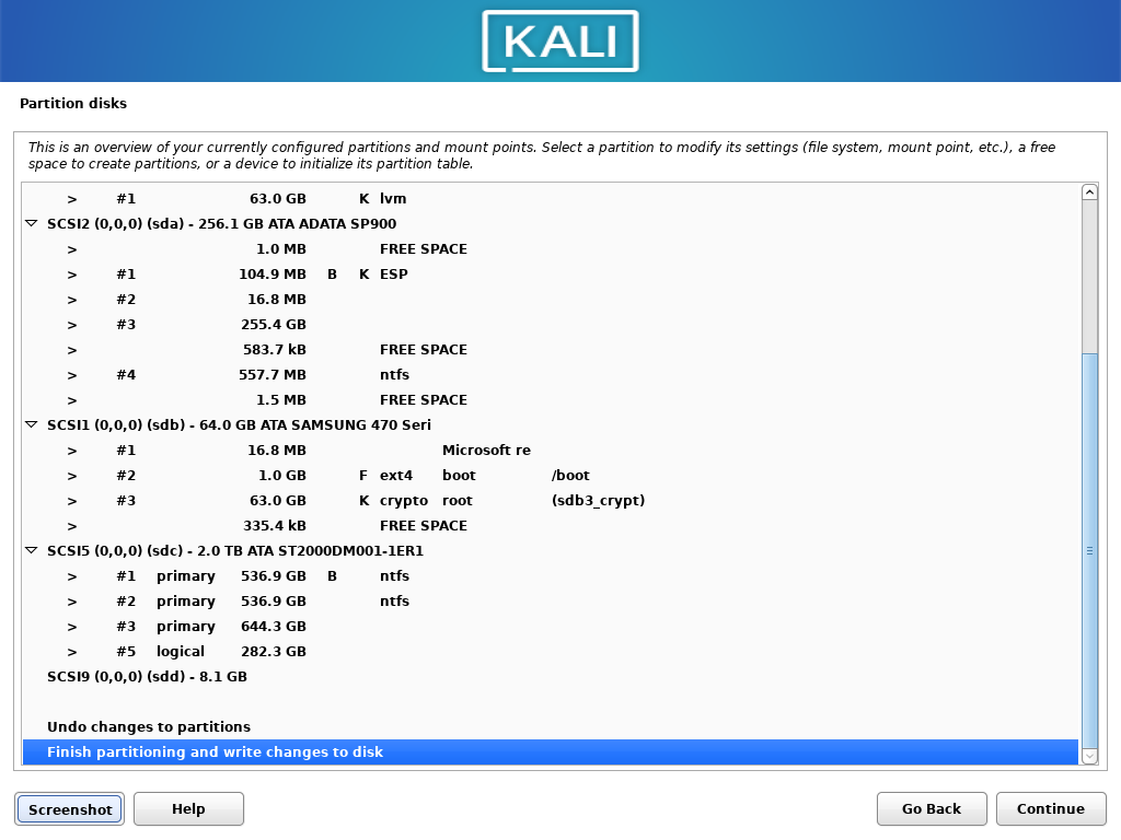 "Finish partitioning and write changes to disk"를 누르면 본격적으로 Kali Linux의 설치가 진행됩니다.