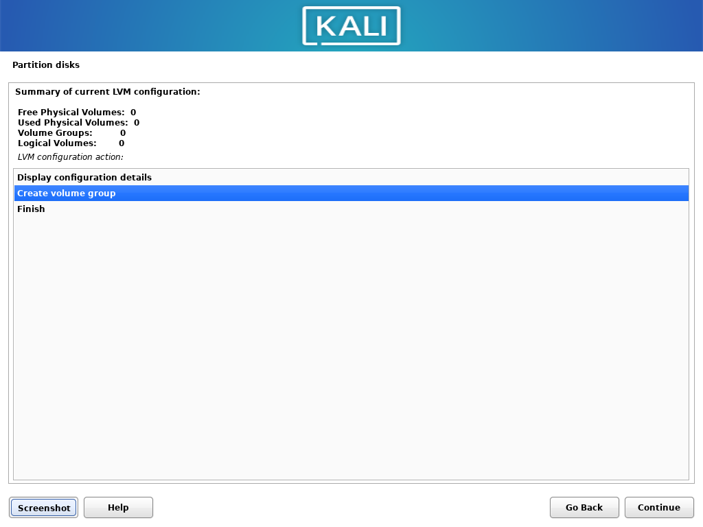 먼저 Create volume group 메뉴를 선택하고 Continue를 눌러주세요.