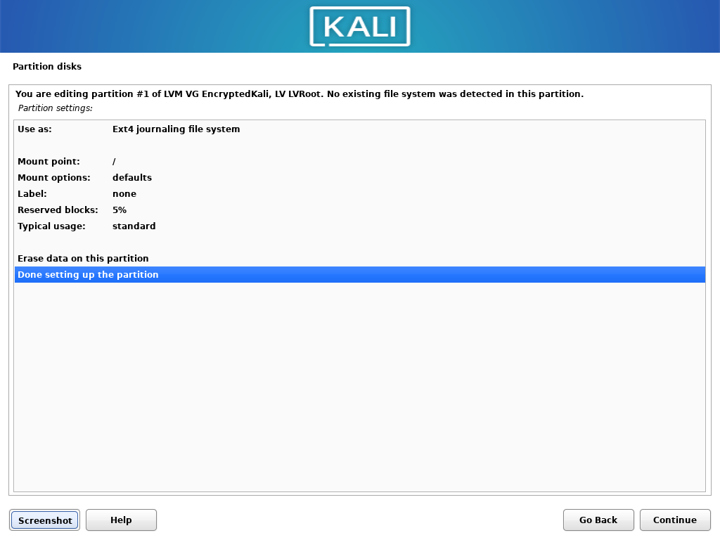 이제 기본적인 파티셔닝이 끝났습니다. "Done setting up the partition"을 눌러서 파티셔닝을 종료합니다.