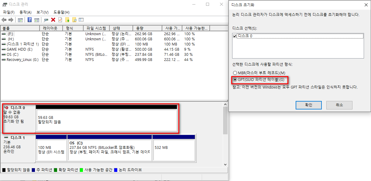 운영체제가 설치된 디스크 1(GPT)와 마찬가지로 디스크 0 역시 GPT로 꼭 바꿔주셔야 합니다. (본인의 Disk 번호 잘 확인하세요, 저와 다를것입니다.)
