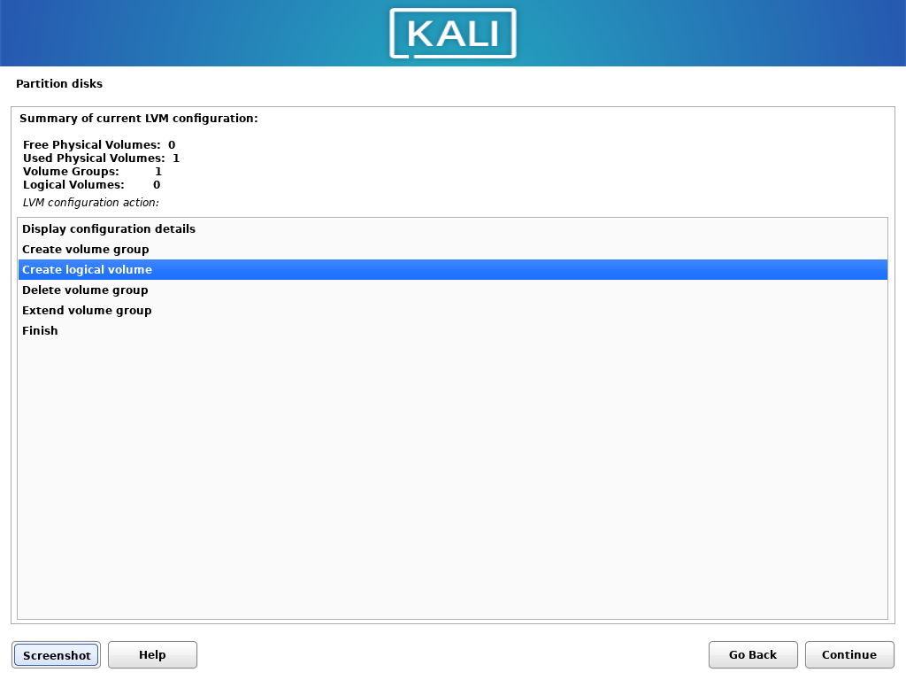 그 다음 "Create logical volume" 메뉴를 선택하고 "Continue"를 눌러주세요.