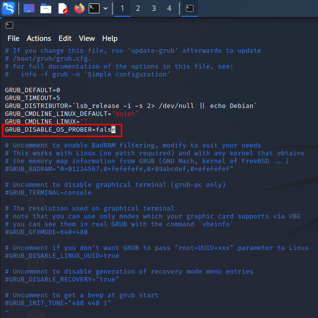 위 사진처럼 GRUB_DISABLE_OS_PROBER=false 를 추가해주세요.