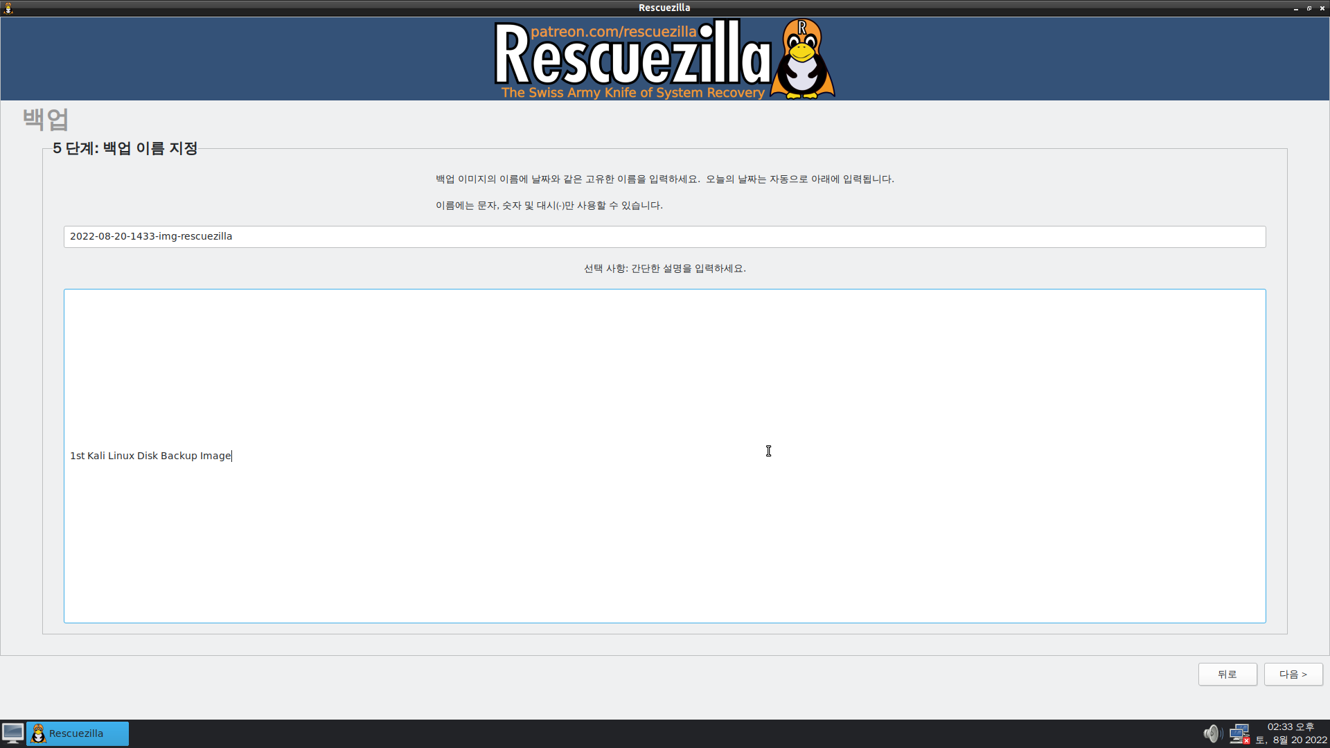 [백업 이름 지정] 화면에서는 저장될 백업 이미지의 이름을 설정할 수 있습니다.