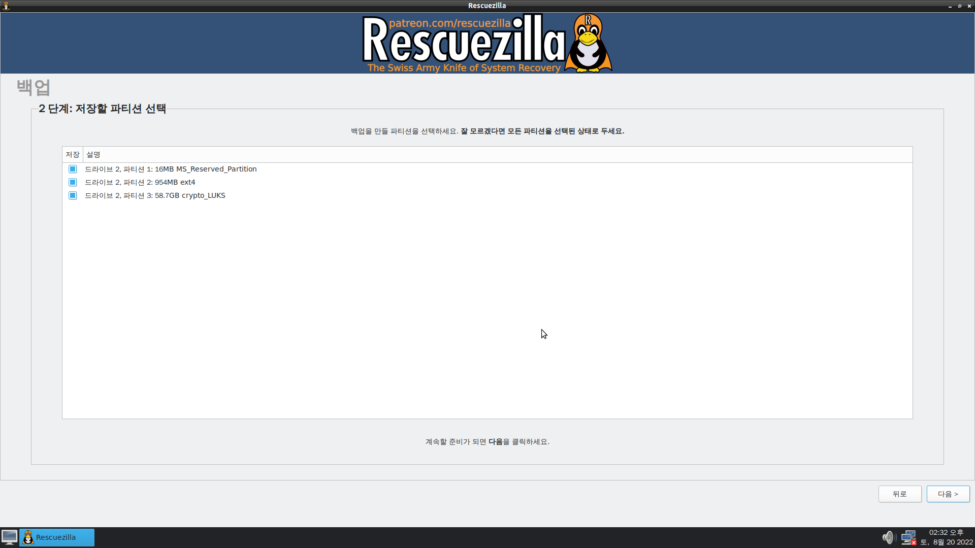 [저장할 파티션 선택] 화면에서는 백업 드라이브에 있는 파티션을 선택적으로 백업할 수 있습니다. 기본적으로 전체 파티션이 선택됩니다. 백업이 불필요한 파티션은 '체크 박스'를 클릭하여 선택 해제 할 수 있습니다.