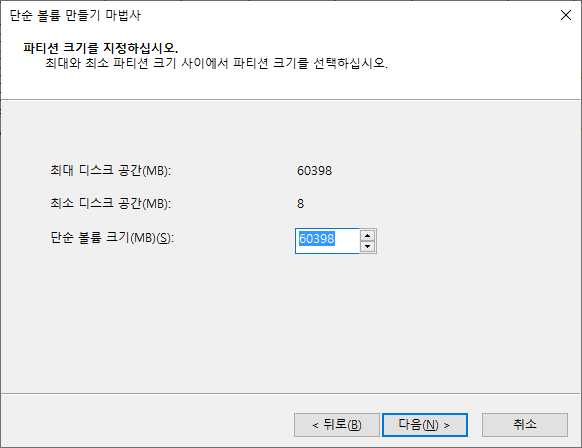 USB 전체 용량으로 단일 볼륨을 생성하시려면 자동 입력된 숫자 그대로 사용하시면 됩니다.