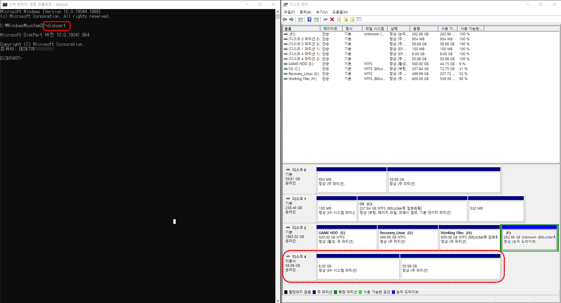 이제, 전체 화면에서 좌측은 명령 프롬프트, 우측은 디스크 관리로 나눠 동시에 확인하면서 작업할 수 있습니다.
