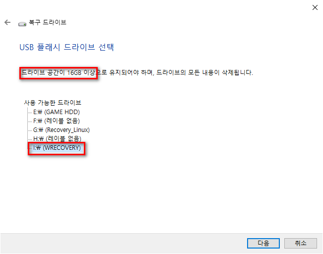 USB 드라이브의 드라이브 명과 레이블명을 잘 확인하시고 선택하시면 됩니다.