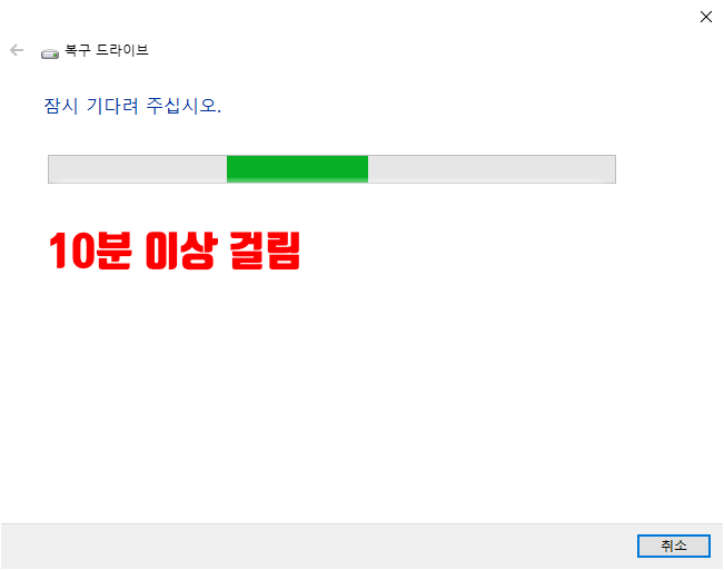 준비 시간만 약 10분 이상, 설치 USB를 선택하고 본격적인 복구 드라이브 만드는 시간이 1시간 30분 정도 걸릴 수 있습니다. 생각보다 오래 걸립니다.