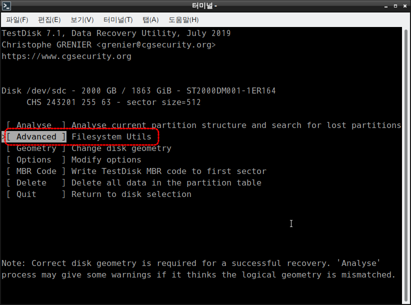 지워진 파티션(lost partitions)을 복구하는 경우 Analyse 메뉴, 삭제된 파일을 복구하기 위해서는 Advanced 메뉴를 선택하시면 됩니다.