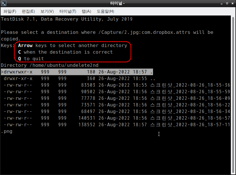 복구할 파일 선택이 끝난 경우 C키(대문자)를 눌러서 다음 단계로 진행합니다.